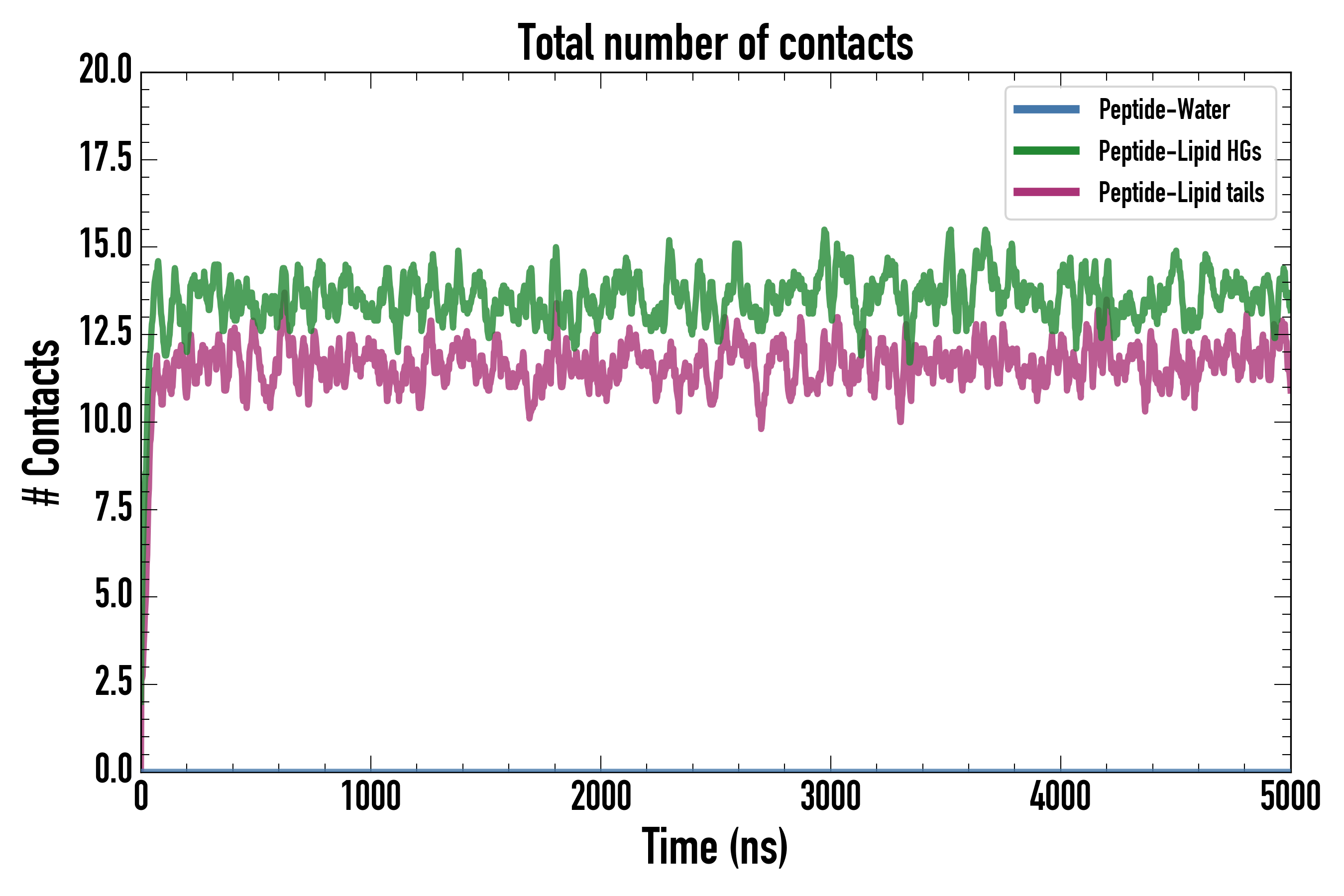 Number of contacts between each residue of the peptide backbone and the different lipid types, averaged over the last microsecond and using a cut-off of 0.6 nm.