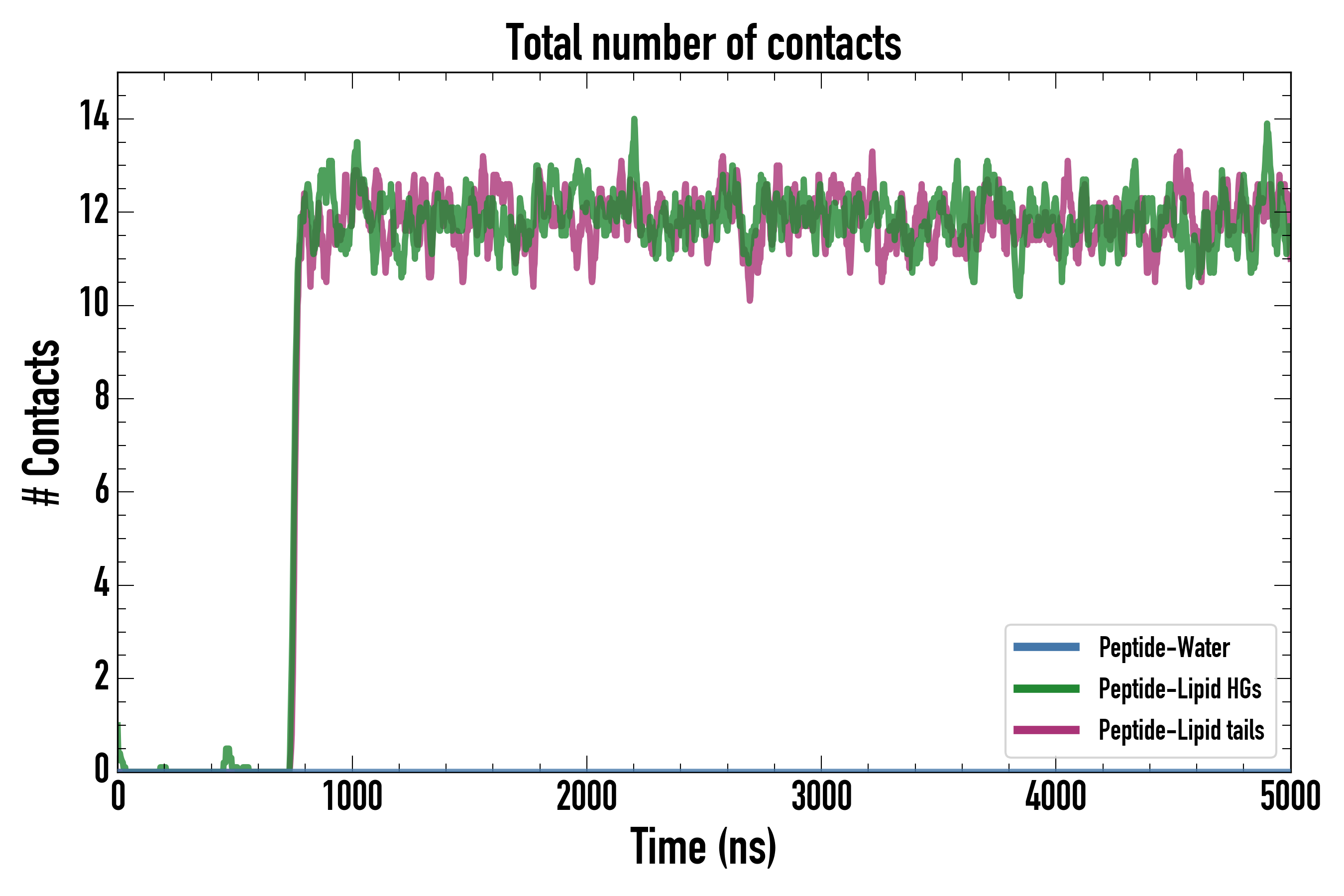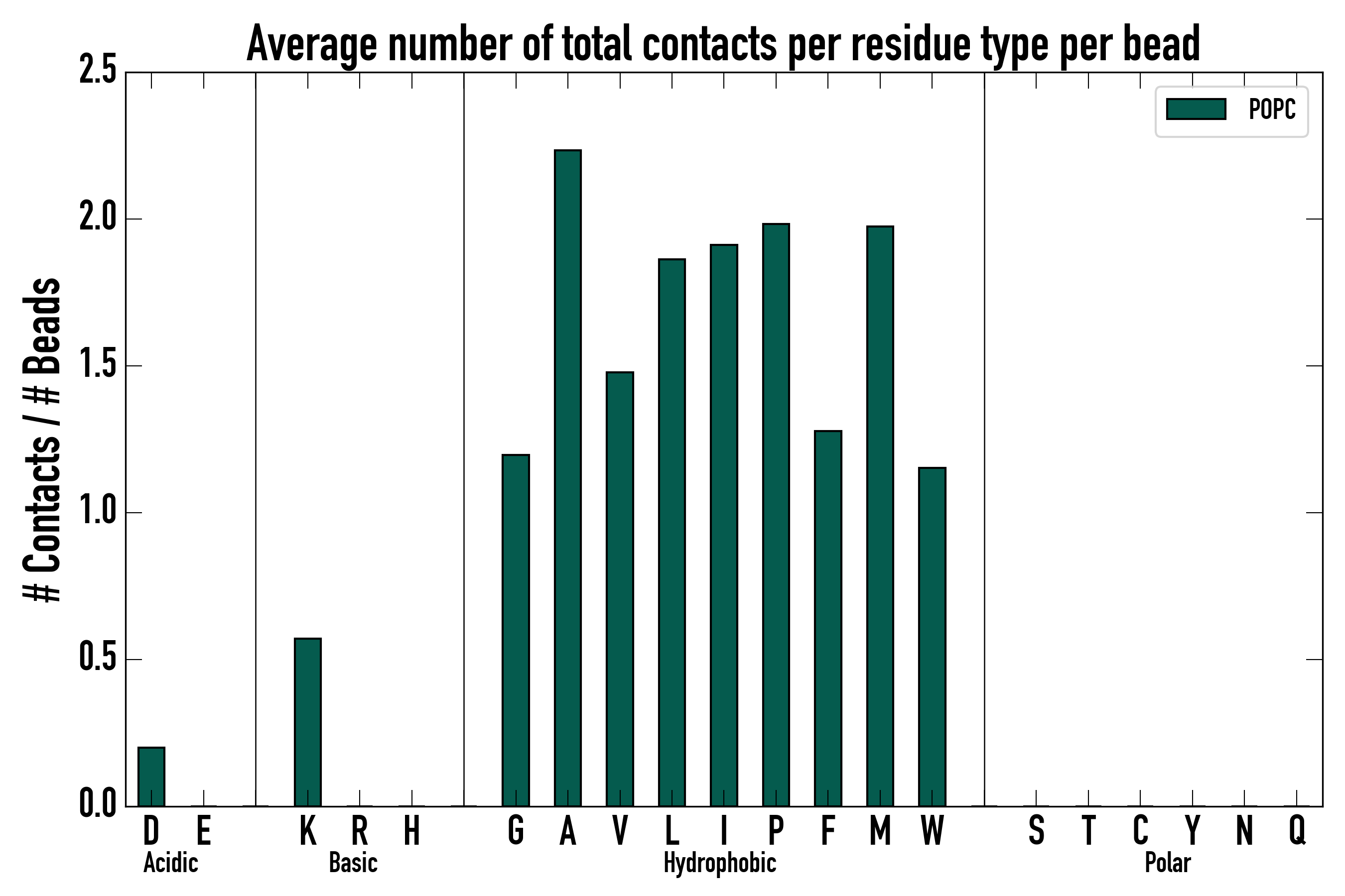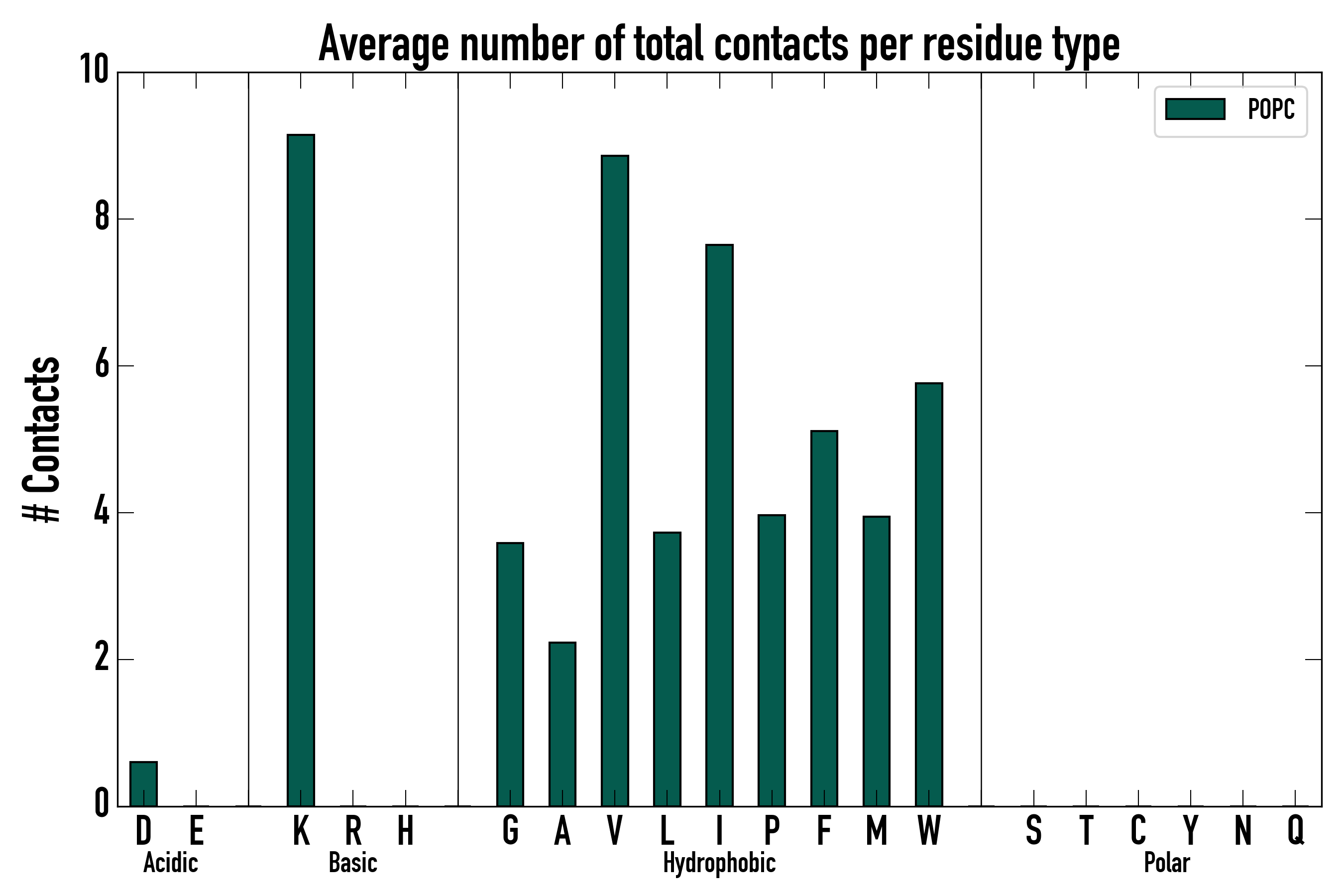 Number of contacts between each residue of the peptide backbone and the different lipid types, averaged over the last microsecond and using a cut-off of 0.6 nm.