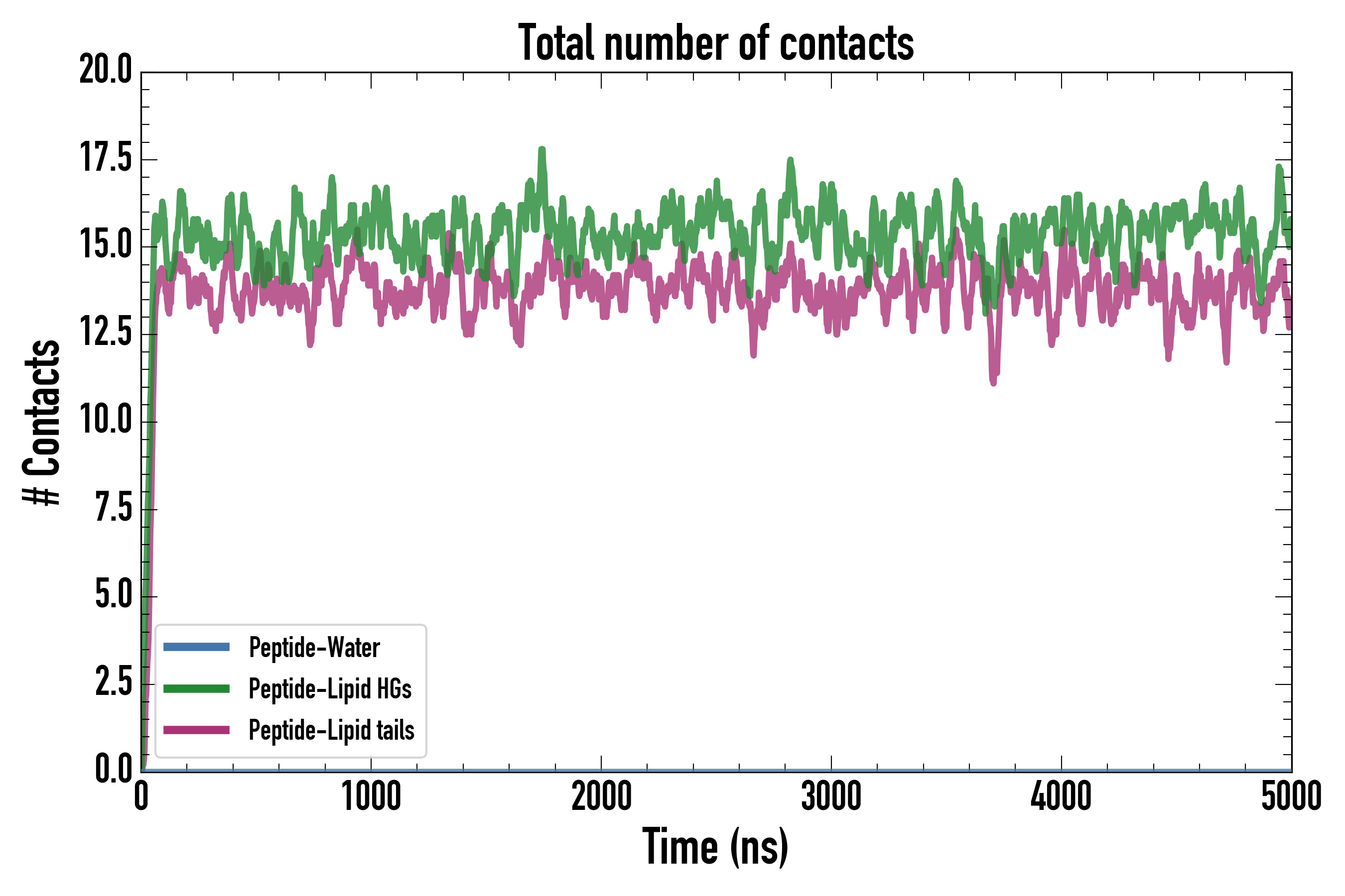 Number of contacts between each residue of the peptide backbone and the different lipid types, averaged over the last microsecond and using a cut-off of 0.6 nm.